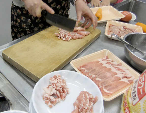 材料(にんじん、豚肉、)を千切りする。