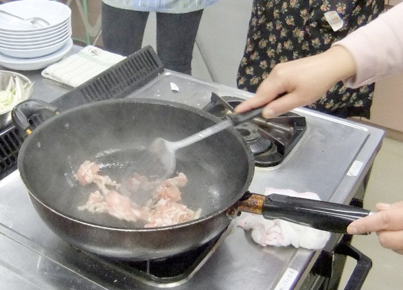 中華鍋に油としょう油、ニンニクを入れ、肉を炒める。七味唐辛子も加える。